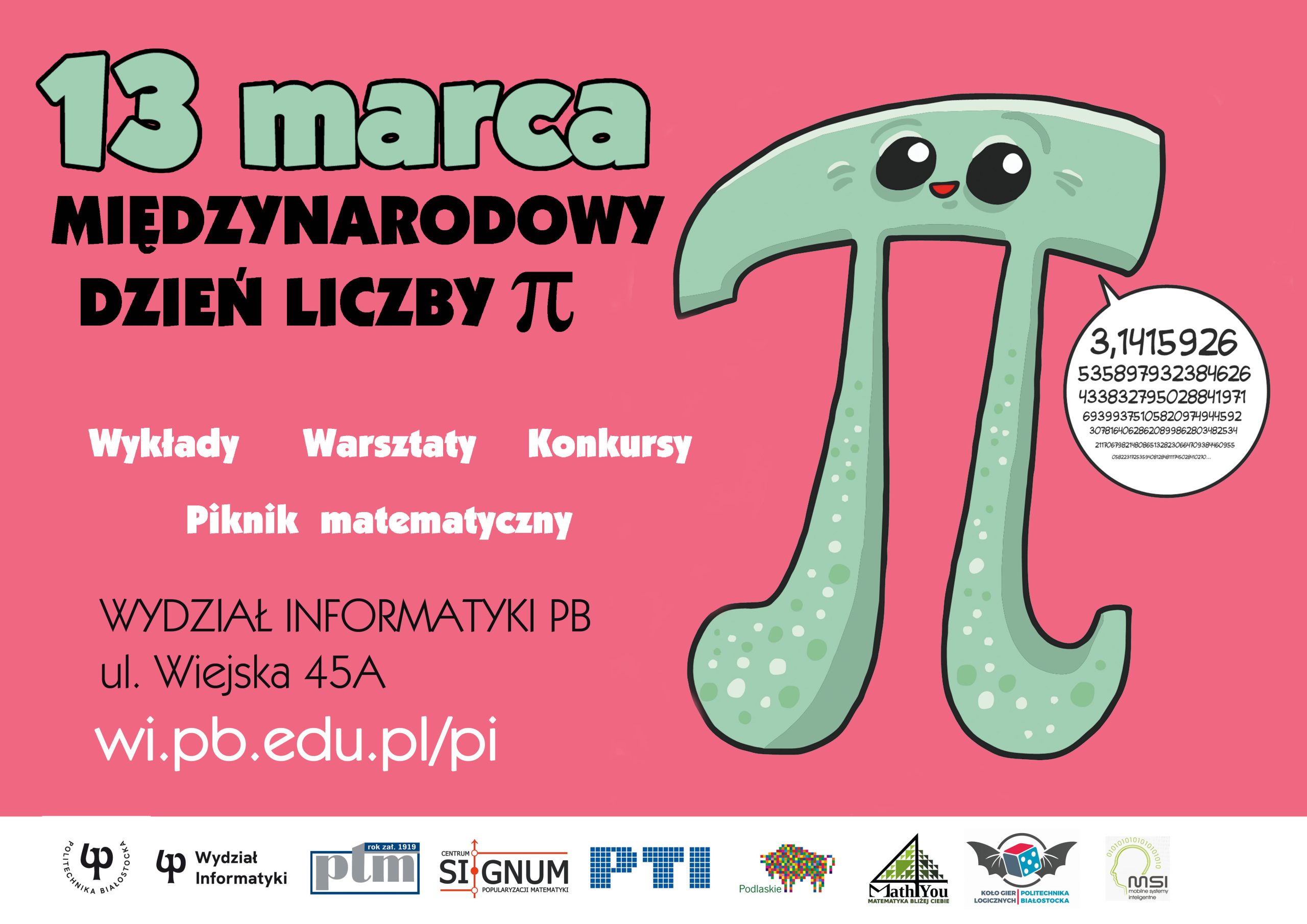 Serdecznie zapraszamy do udziału w obchodach Międzynarodowego Dnia Liczby π, które odbędą się 13 marca 2026 r. (piątek) na Wydziale Informatyki Politechniki Białostockiej przy ul. Wiejskiej 45A w Białymstoku.