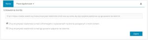 W ustawieniach konta możliwa jest konfiguracja otrzymywania wiadomości elektronicznych oraz ich grupowanie, opcje zaznaczone oznaczają potwierdzenie opcji, natomiast odznaczone odrzucenie. Po zmianach w ustawieniach konta należy pamiętać o ich zapisaniu używając przycisku Zapisz, w przeciwnym wypadku dane zostaną utracone.