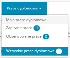 Student może przeglądać prace dyplomowe do których ma dostęp w ramach zapotrzebowań poprzez kliknięcie w menu opcji Prace dyplomowe, a następnie opcji Wszystkie prace dyplomowe.